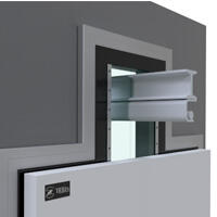 Распашные двери РД(КС) - коммерческая серия, предназначенная для среднетемпературных и морозильных камер, складов, производств с умеренным трафиком. Допускается эксплуатация в условиях экстремальных температур (-33...+55°C). Конструкция включает многослойное полотно (80мм, 100мм, 120мм,150мм), с механическим разрывом мостика холода, обшивками толщиной 0,45мм, цвет RAL9003 и резиновым уплотнителем по периметру. Рама из алюминиевого профиля или холоднокатаной стали толщиной 1,5мм, с износостойким покрытием. Двери оснащены подъемными петлями, которые обеспечивают плотное прилегание уплотнителя к плоскости рамы.